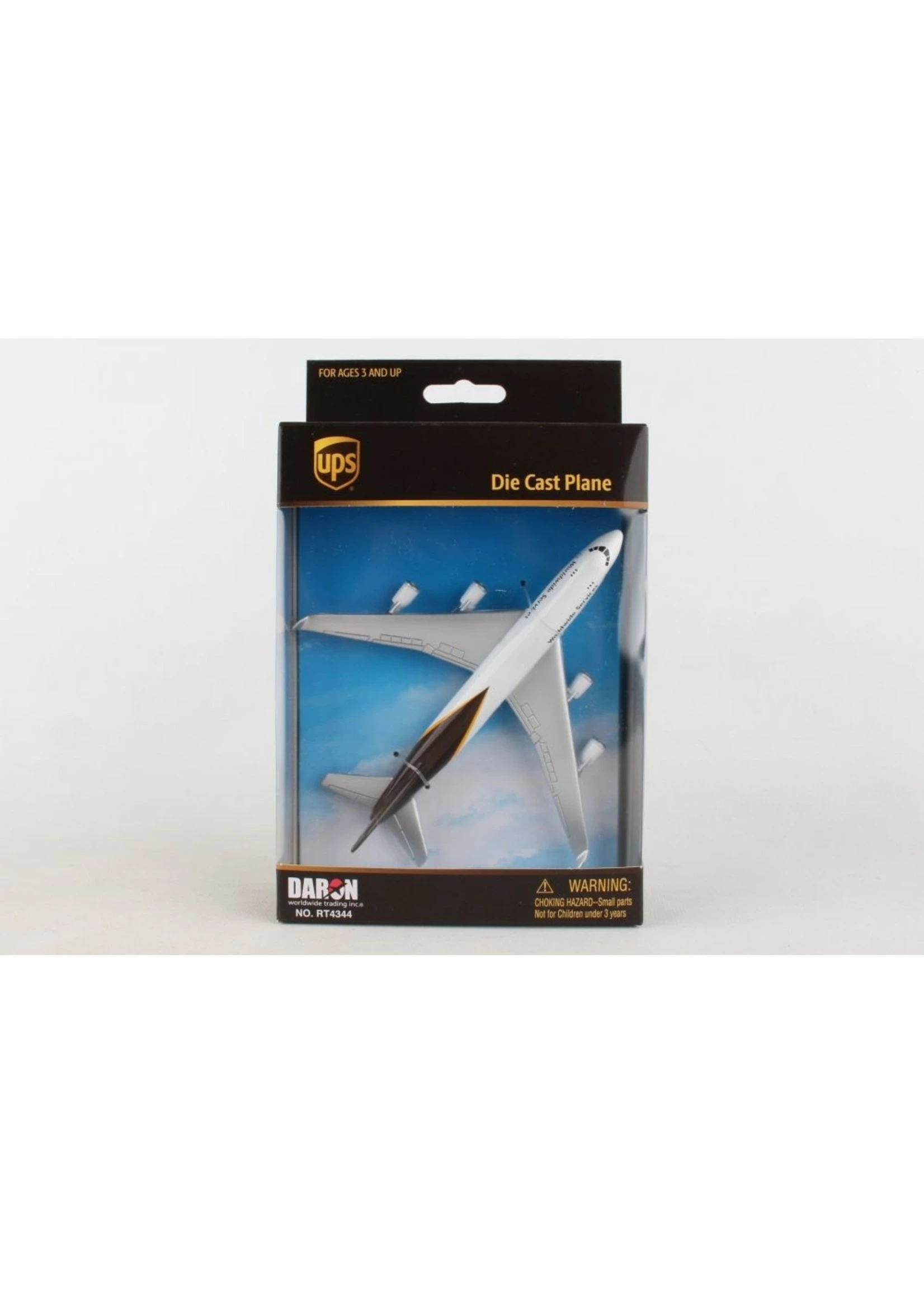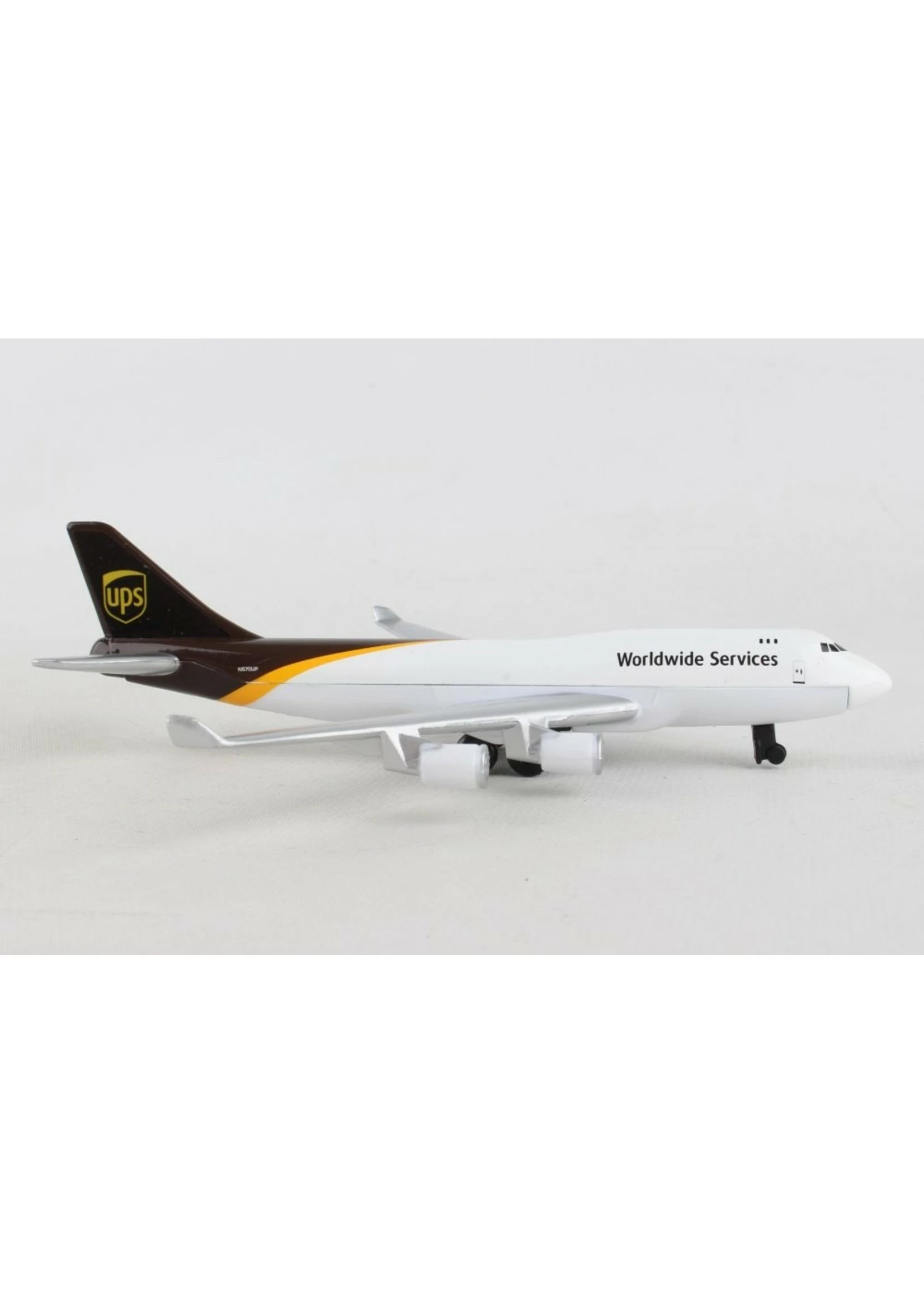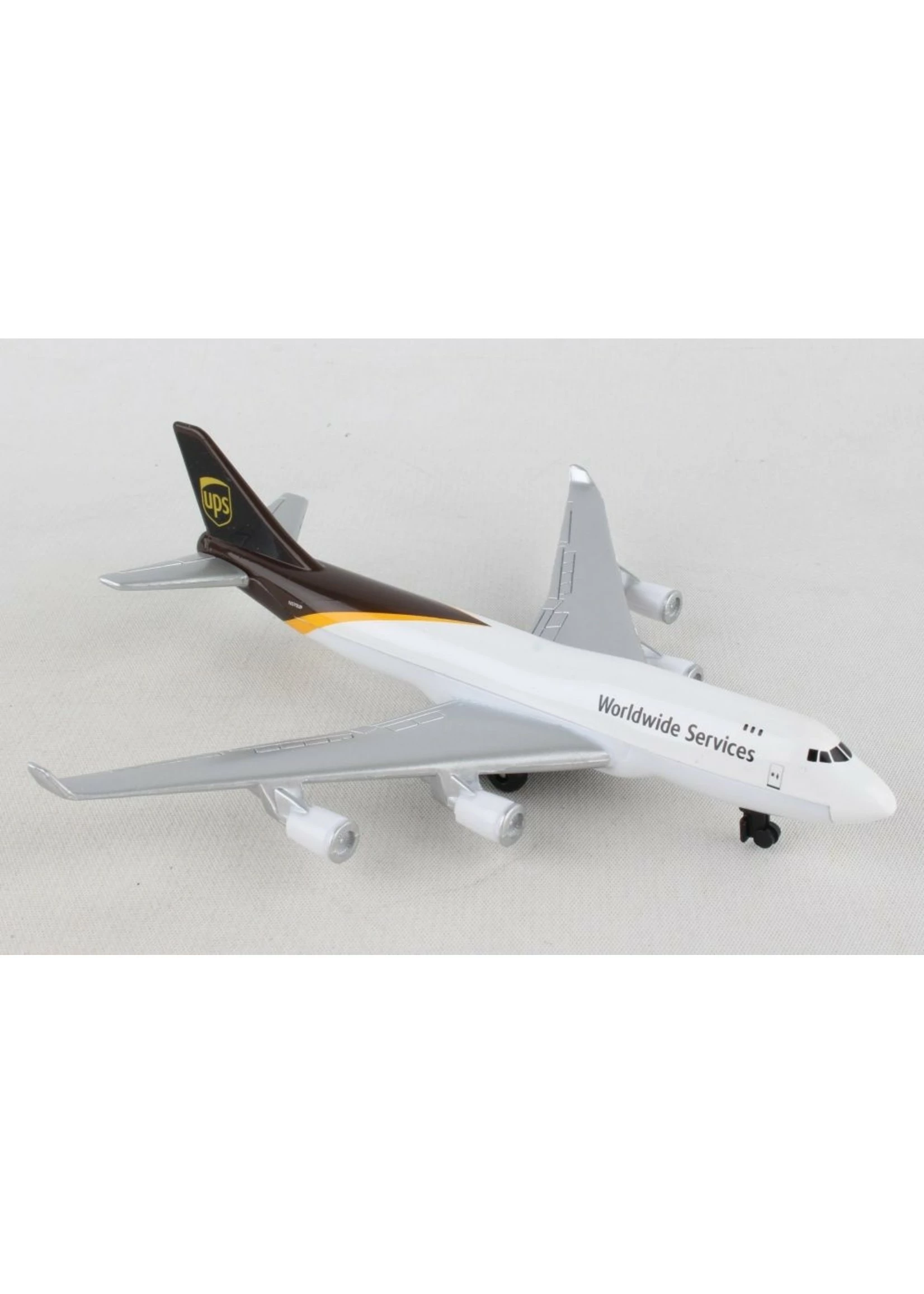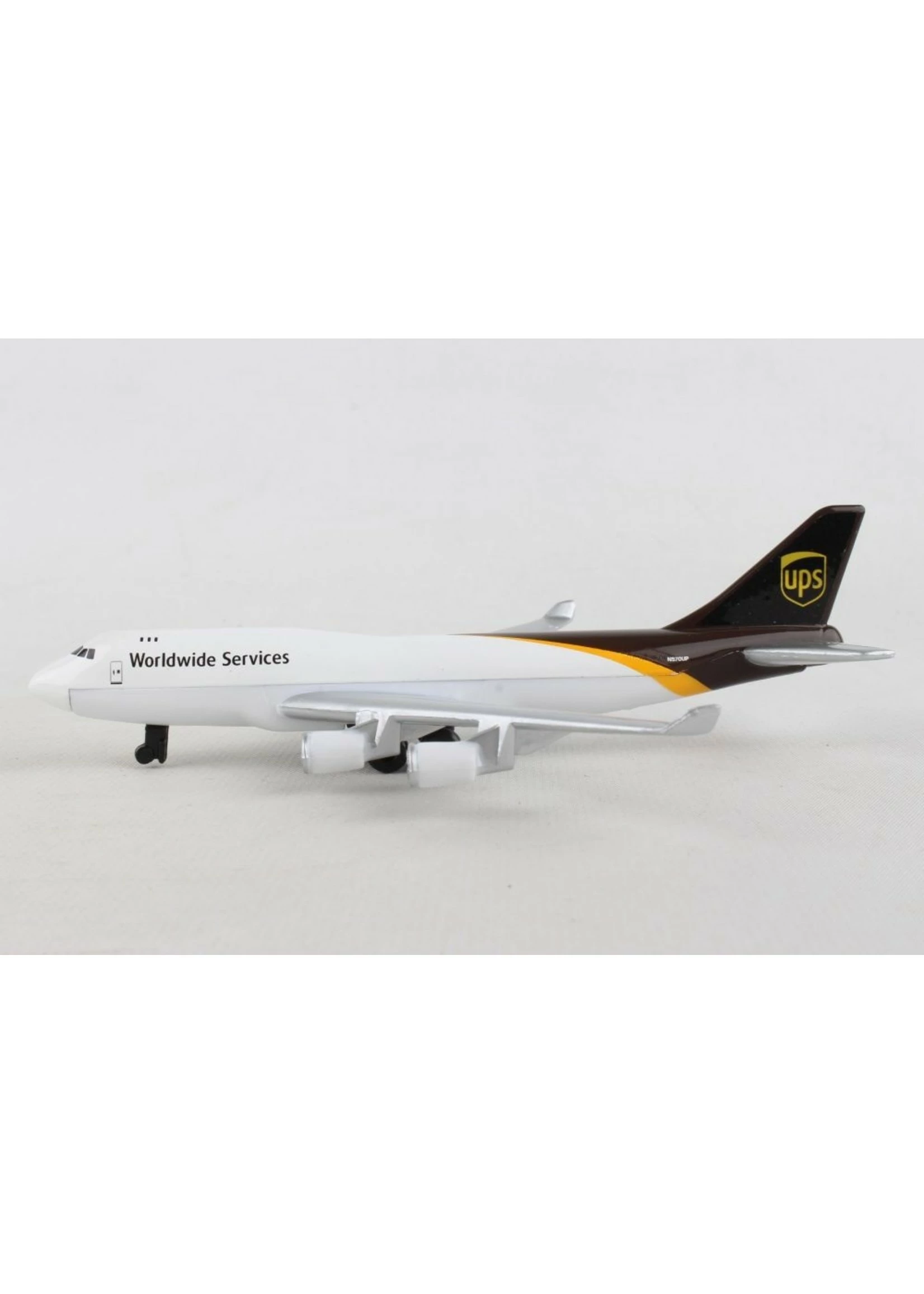 This authentic die cast Boeing 747 plane contains four engines and sports the UPS logo on its tail. It is made of die cast metal.