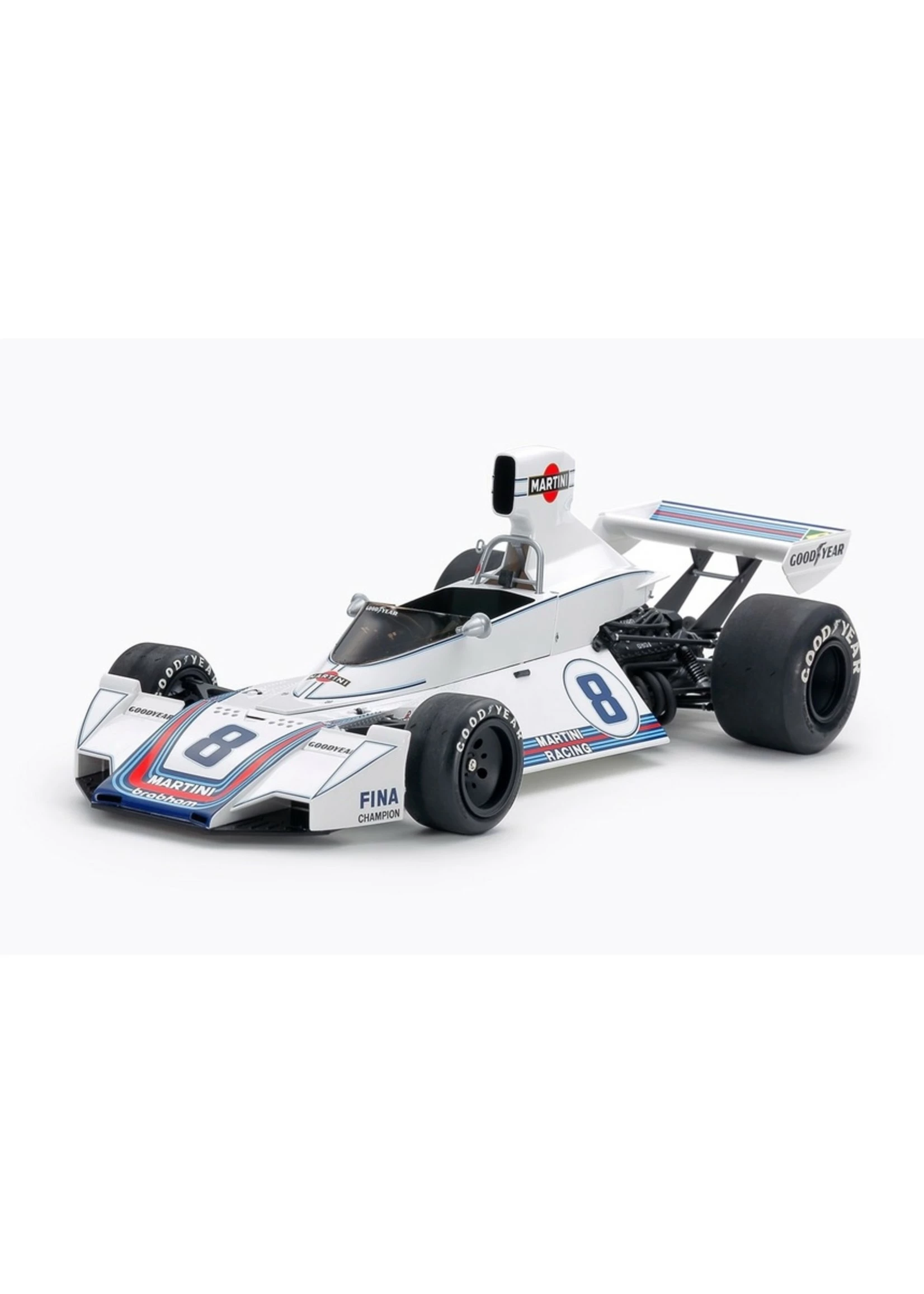 This is a re-release of our legendary 1/12 Big-Scale Martini Brabham BT44B from 1975. Motor Racing Developments designer Gordon Murray evolved the design of this car which features a monocoque body with a distinctive triangular cross-section and wedge-shaped form. Also, Carlos Pace drove the car to a 1st place finish at the Brazil GP and namesake Carlos Reutemann did the same at the German GP, making it one of the more competitive cars in the field during the 1975 Formula One season. The model recreates the lively color scheme of the car, and has a realistic look with Martini and Goodyear logos.